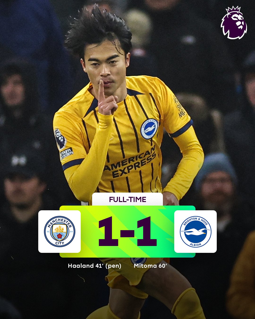 怪我から復帰2戦目の三笘薫は、マンチェスターシティ戦に先発出場。0-1の後半15分、左サイドからドリブルで中に切り込みシュートを放つと、この試合の同点ゴールを決めた。試合は1-1で引き分けた。